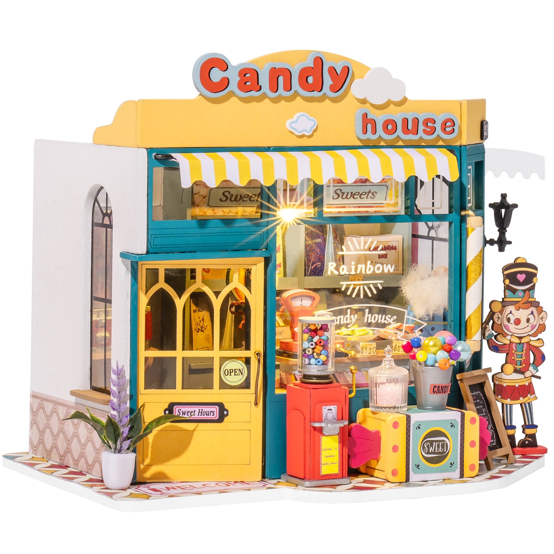 In our childhood, many of us have dreamed of bringing all the candy in the world to create a fabulous, huge candy house with a gorgeous glow... Now, this wonderful dream is realized in the form of DIY miniature house! This Rolife Rainbow Candy House miniature dollhouse kit uses yellow-green as the main color, and red sky blue as a secondary color, which gives you an overall colorful rainbow look. Imagine when the key opens the door of the candy house, colorful crystal clear candies explode like magic balls, bringing beauty and joy! Have fun building this candy house with your own hands. The surprise is hidden in the next candy!